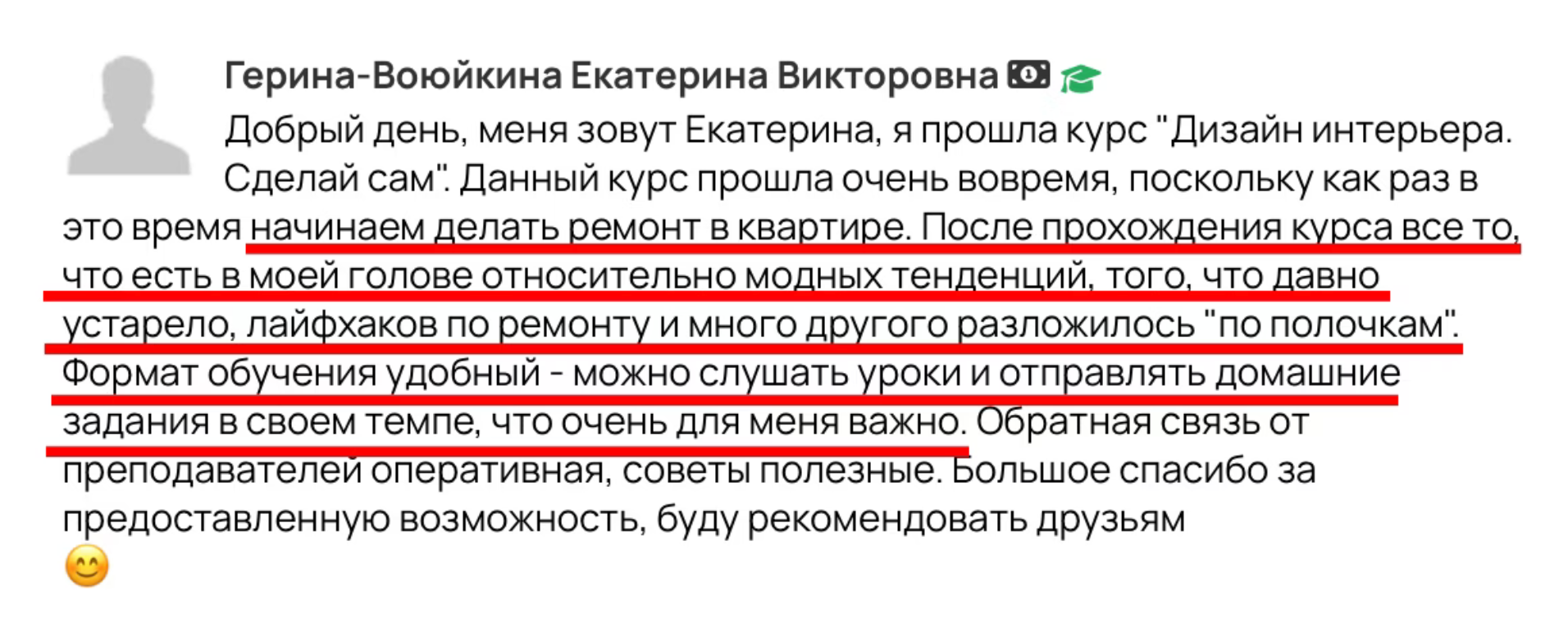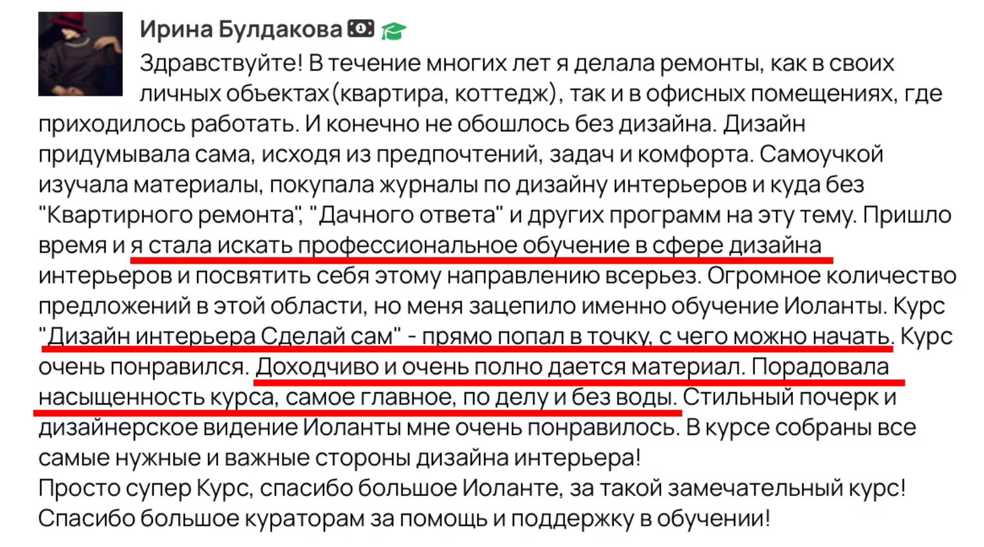 «Я знаю, что значит бояться сделать ошибку в ремонте, потерять деньги и нервы. Именно поэтому я создала этот курс — чтобы у вас была пошаговая система и поддержка на каждом этапе».
